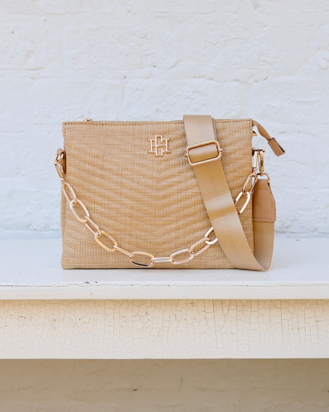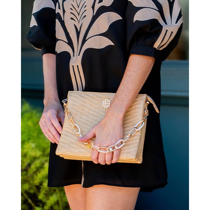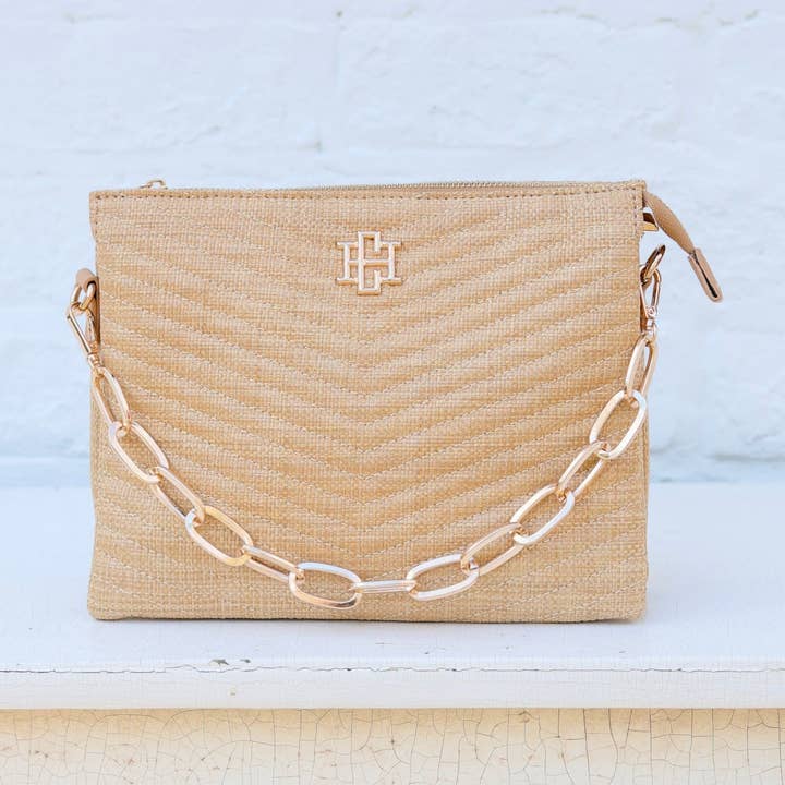 This V quilted straw crossbody is so fashion forward! It has a chunky gold chain accent that is removable, and it can be used as a carrying strap as well. The nylon crossbody strap is super stylish and is also adjustable and removable. The top zipper closure leads to two open compartments as well as a third middle zippered section. It also has two smaller internal open pockets and one zippered pocket.