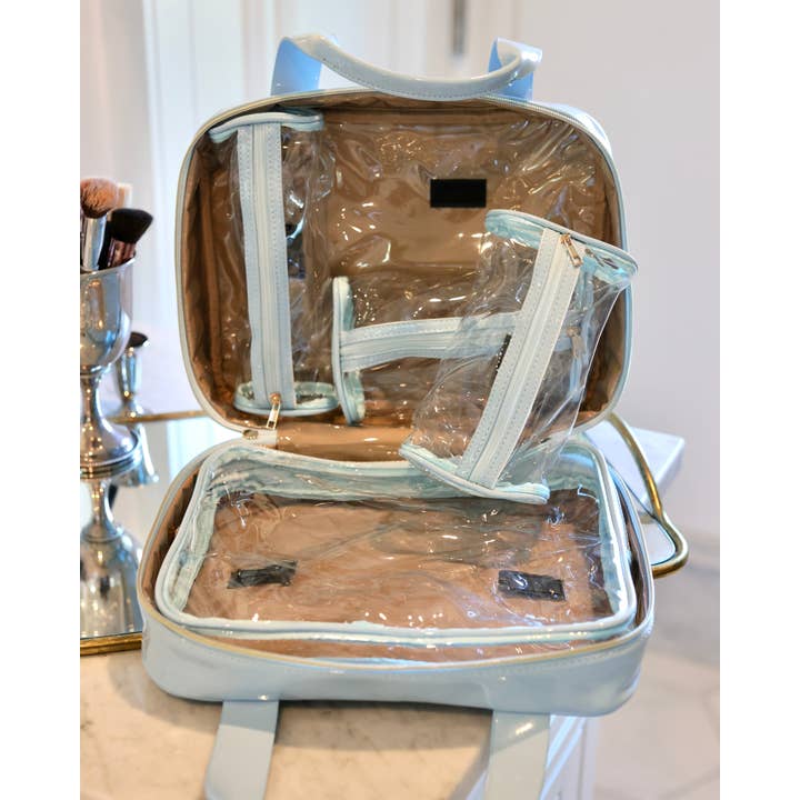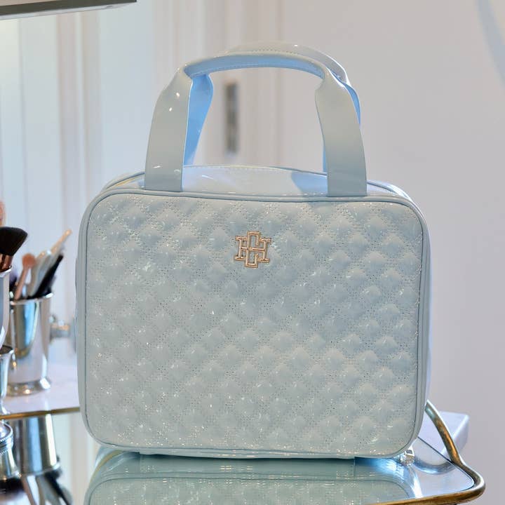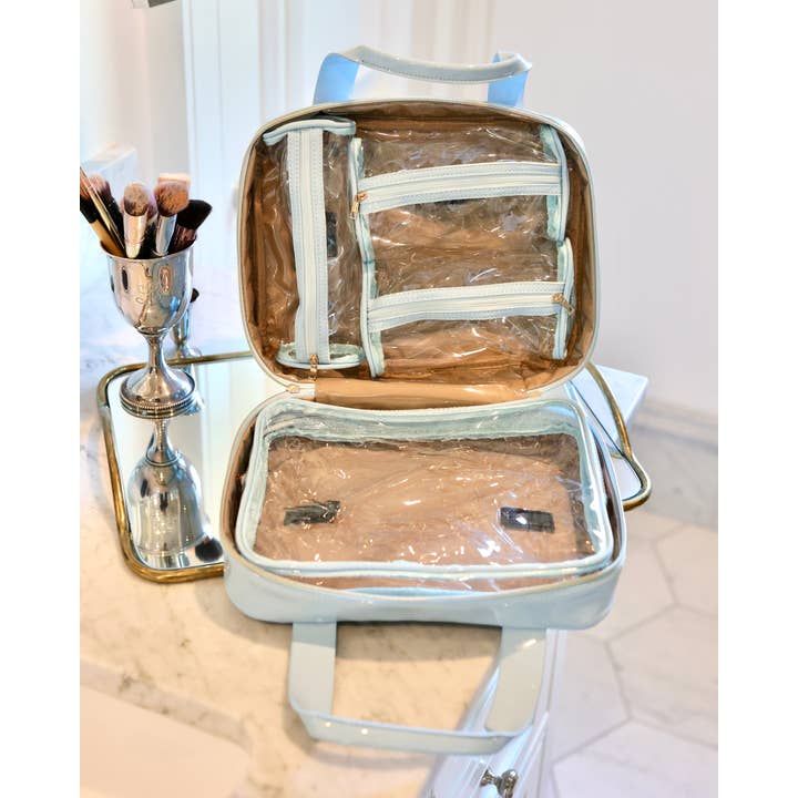 This large case is the ultimate makeup and travel piece. It features a quilted vegan patent leather fabric and two top carrying handles. The three sided zipper allows the case to unfold and lay completely flat, and the interior is lined with a nude fabric with a clear protective material. For ultimate organization, this case has four clear removable pouches that are attached to the interior with velcro. Each removable case has a zipper closure. The possibilities are endless when it comes to what this case can carry- cosmetics, toiletries, chargers, and more.