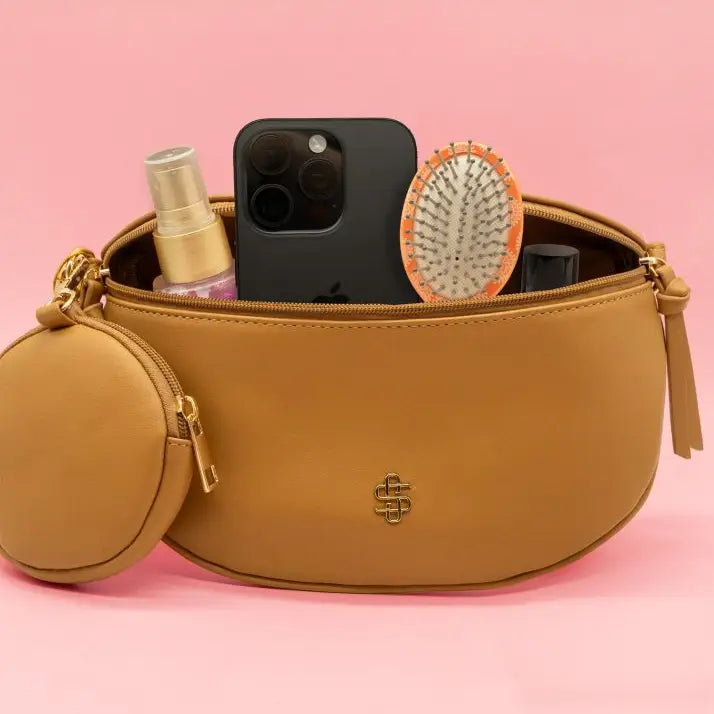 This PU leather cross body bag is perfect for everyday. It features detachable strap, detachable coin pouch, top zippered pocket with additional zippered pocket on the back of the bag, large interior lined pocket with additional interior zippered pocket and Simply Southern