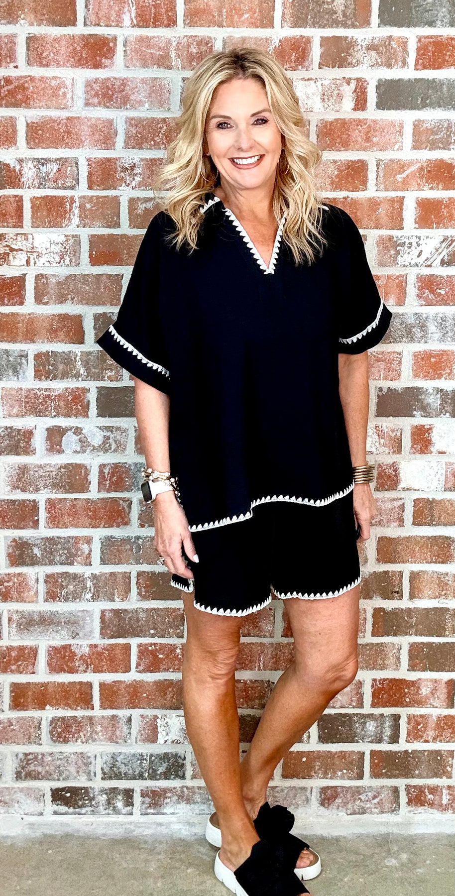 Drawstring waist solid crinkle fabric casual shorts with scallop embroidery detail, side pockets, side slit hem.- Styled with CARRIE TOP