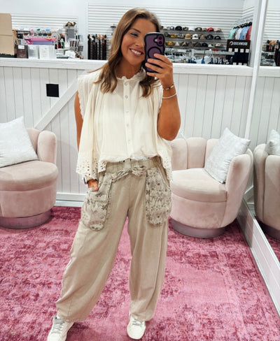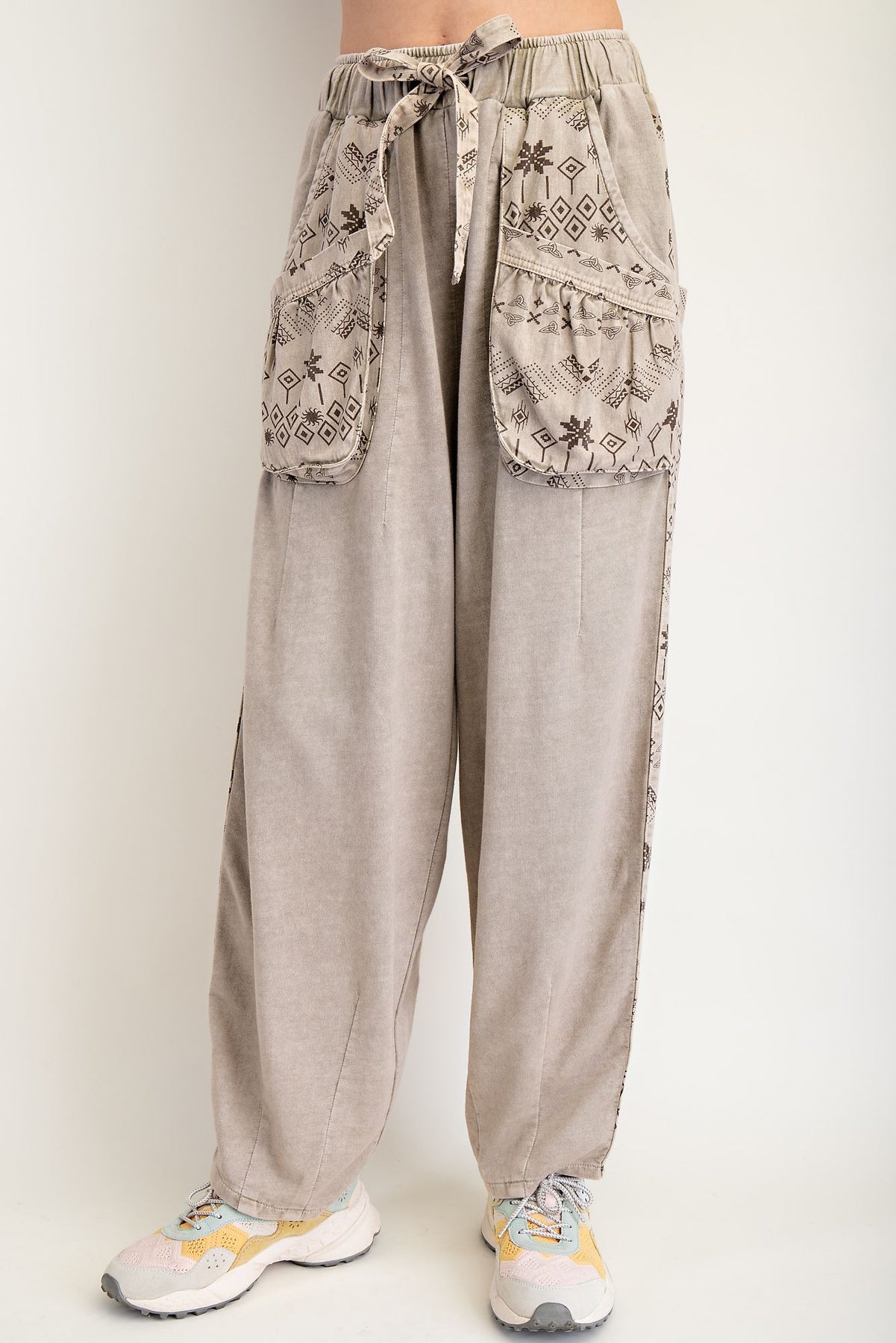 ETHNIC PRINT MIX MINERAL WASHED TWILL BARREL PANTS
