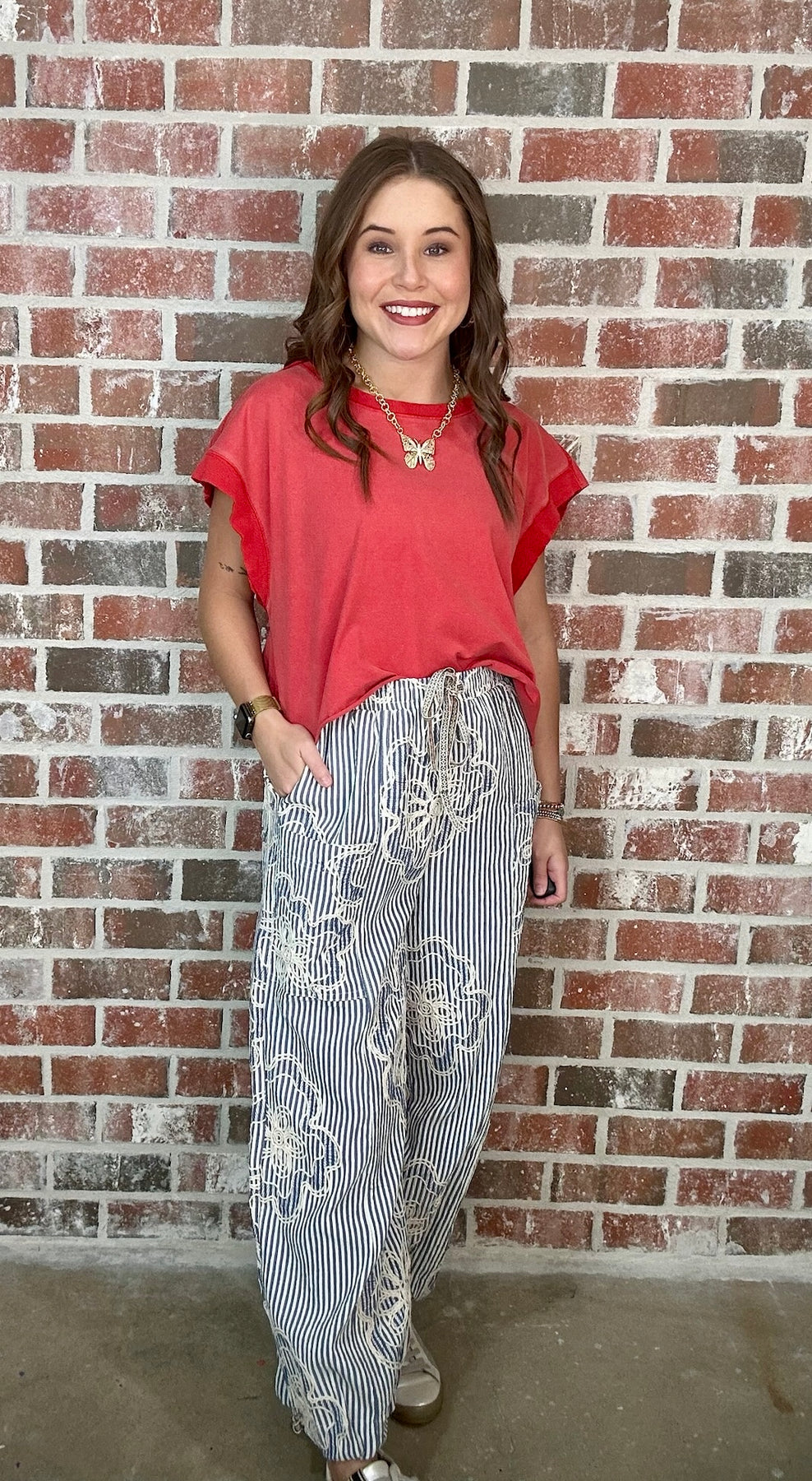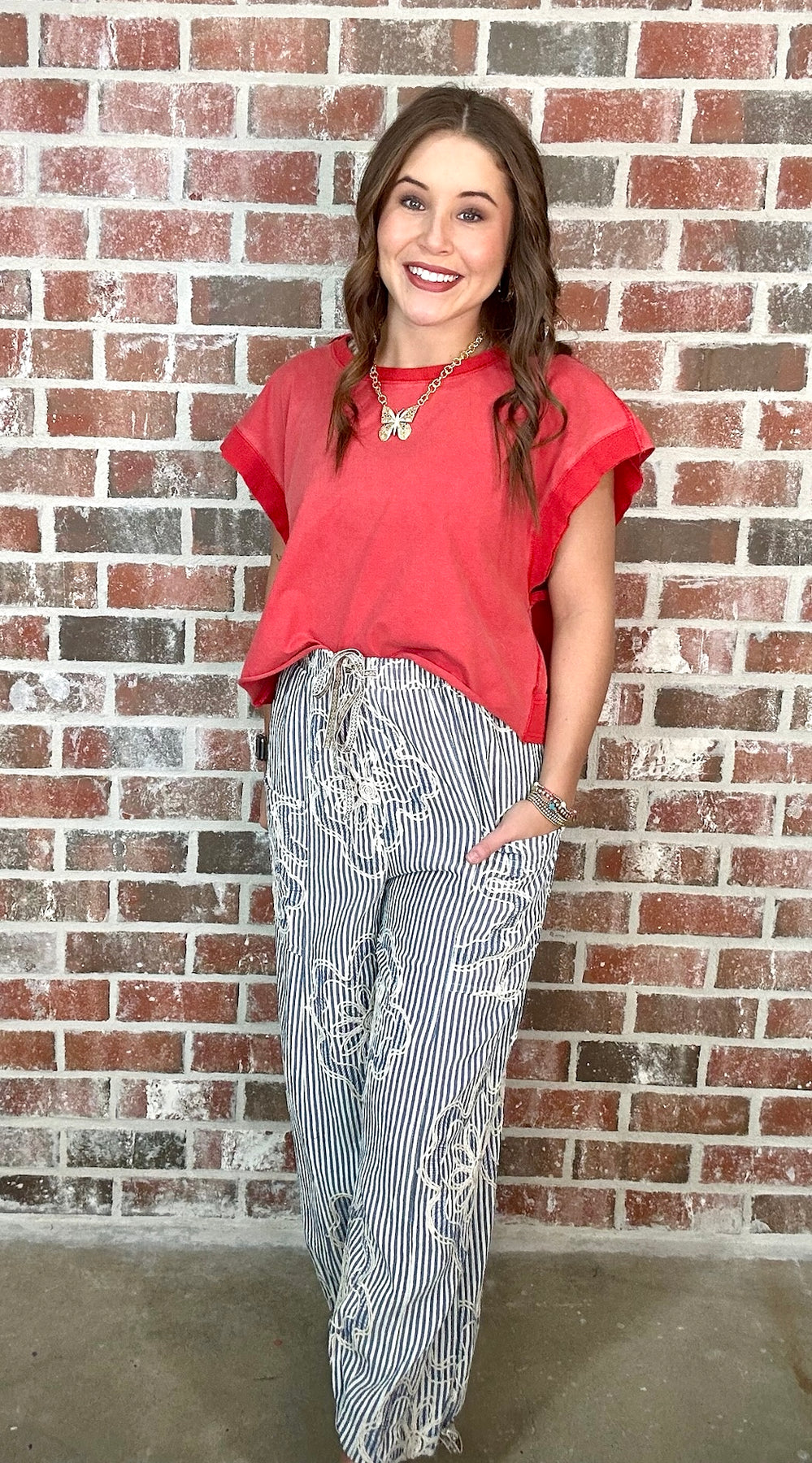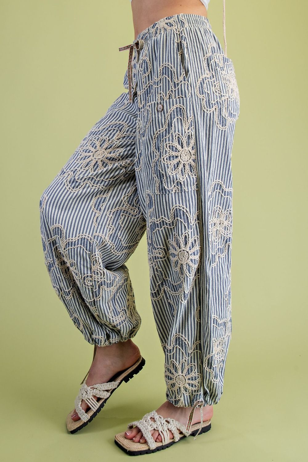 Description: EMBROIDERY STRIPED WOVEN PANTS-VERTICAL STRIPED PANTS-RELAXED, LOOSE FIT SILHOUETTE-ELASTIC WAISTBAND WITH DRAWSTRING TIE-PATCH FRONT POCKETS-FLORAL EMBROIDERY-ADJUSTABLE DRAWSTRING HEMS AT ANKLES-CROPPED LENGTH