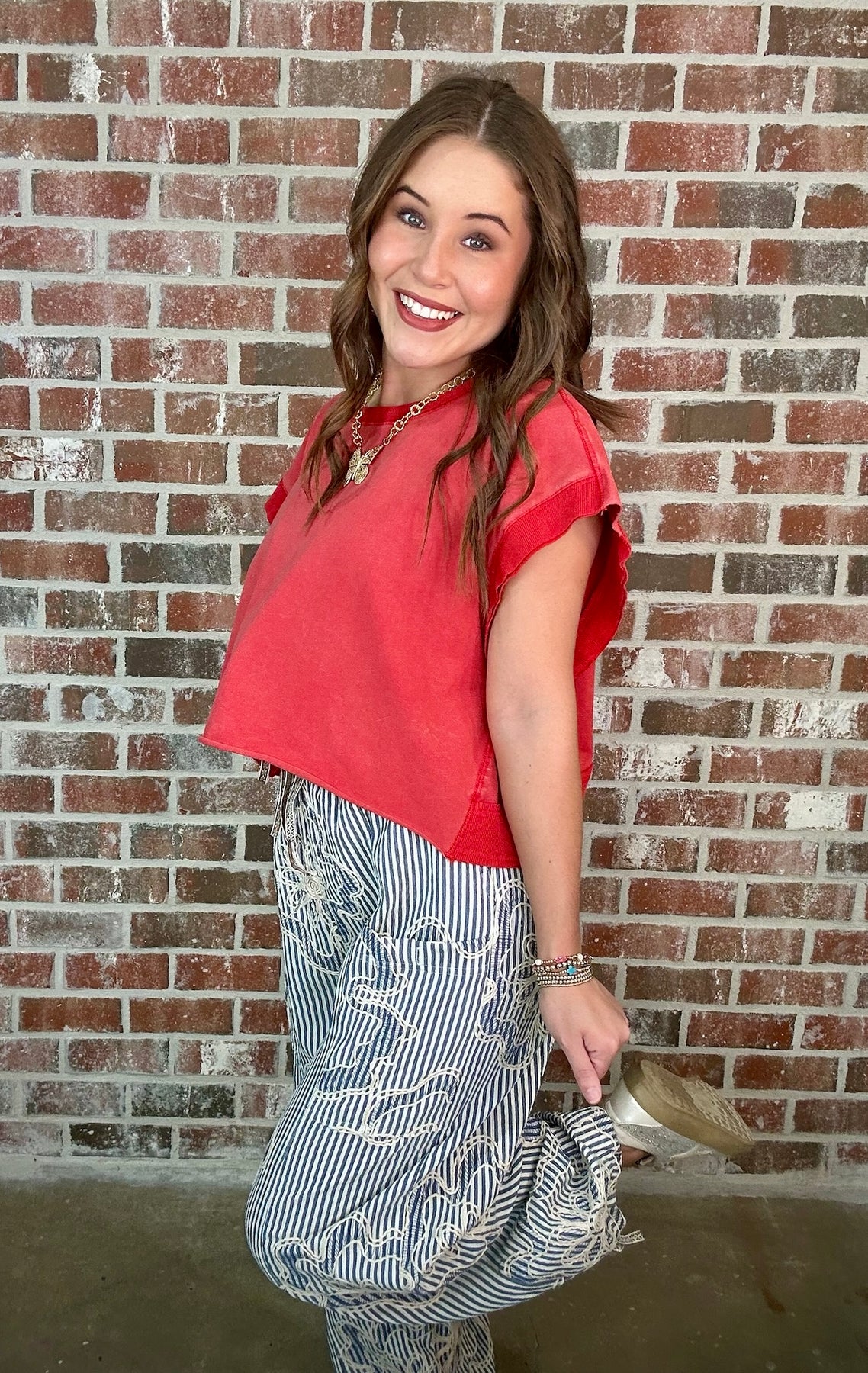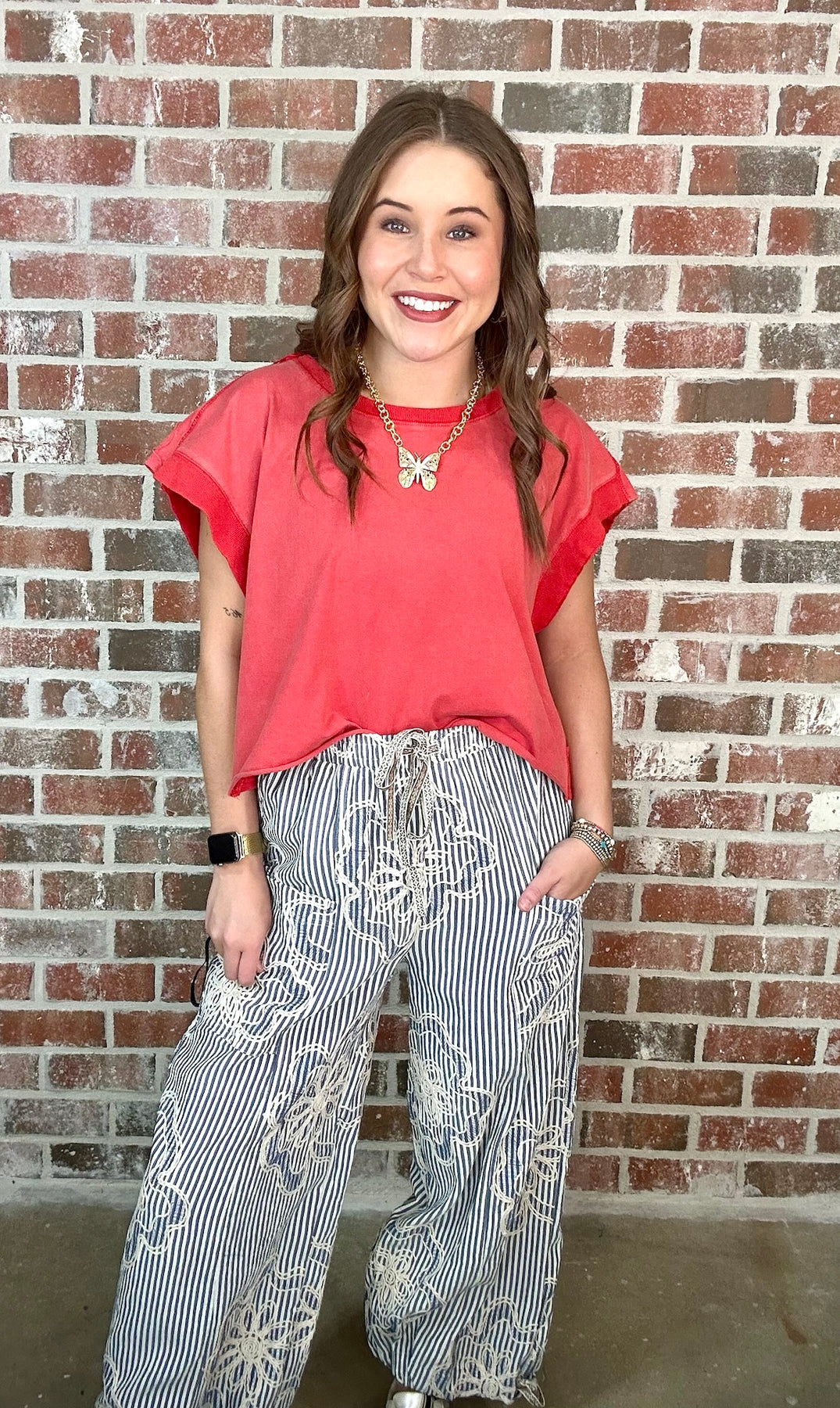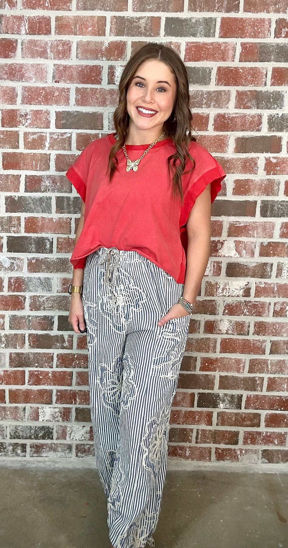 Description: EMBROIDERY STRIPED WOVEN PANTS-VERTICAL STRIPED PANTS-RELAXED, LOOSE FIT SILHOUETTE-ELASTIC WAISTBAND WITH DRAWSTRING TIE-PATCH FRONT POCKETS-FLORAL EMBROIDERY-ADJUSTABLE DRAWSTRING HEMS AT ANKLES-CROPPED LENGTH