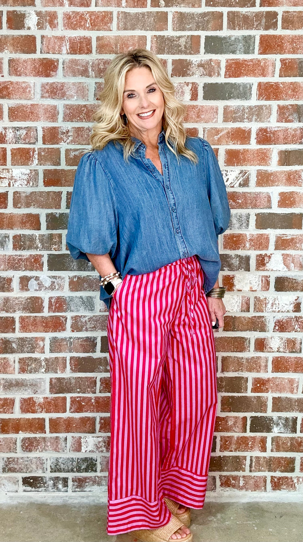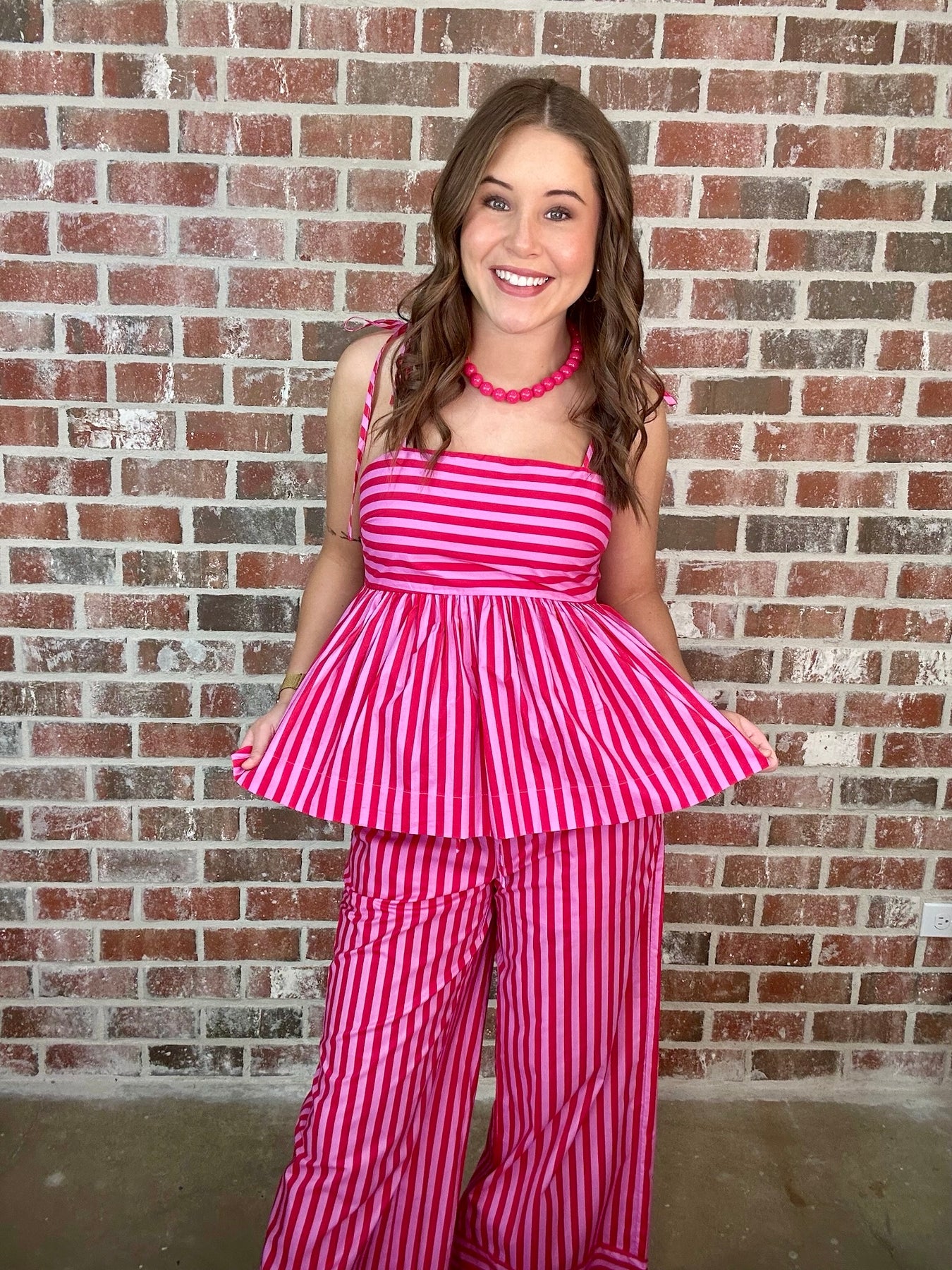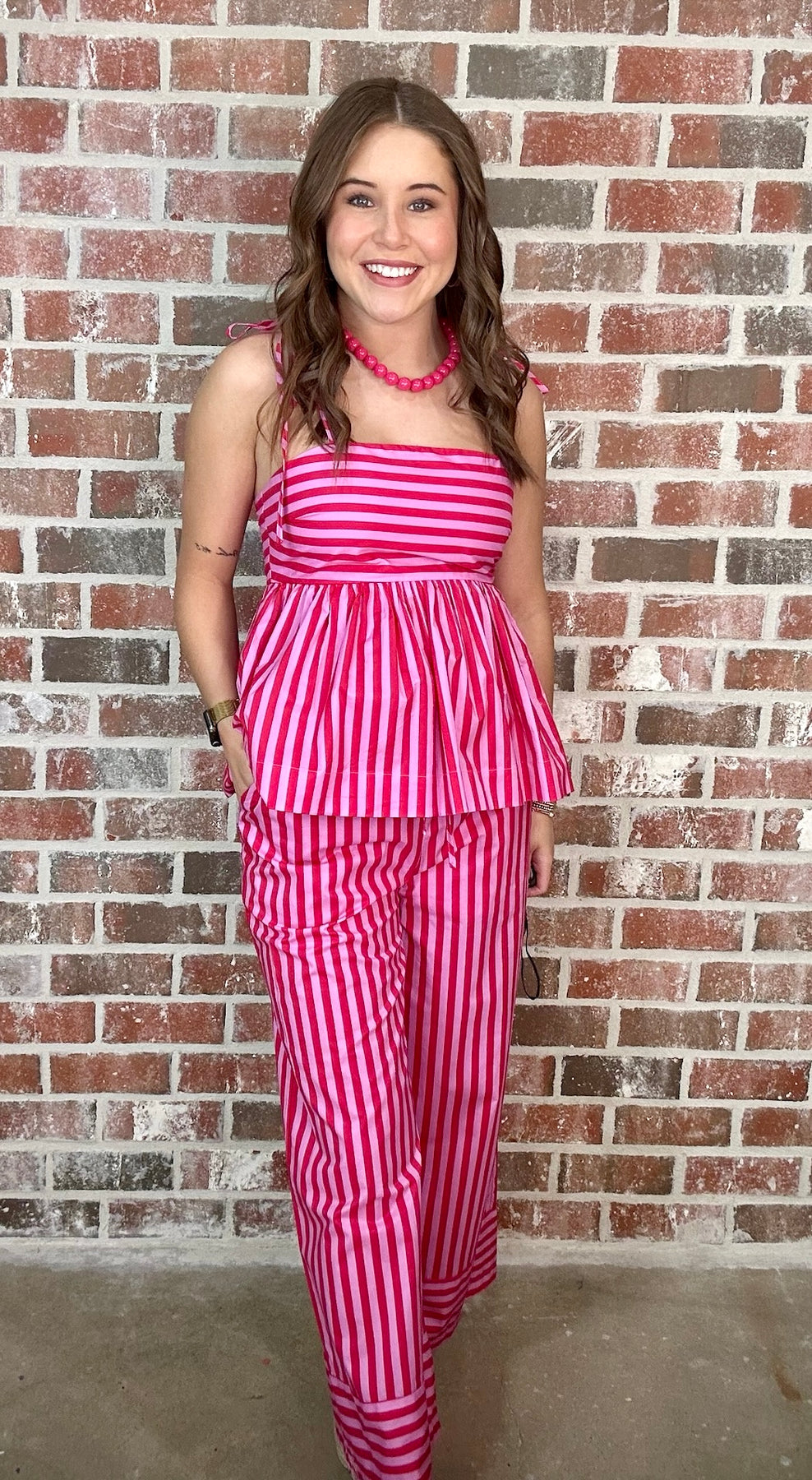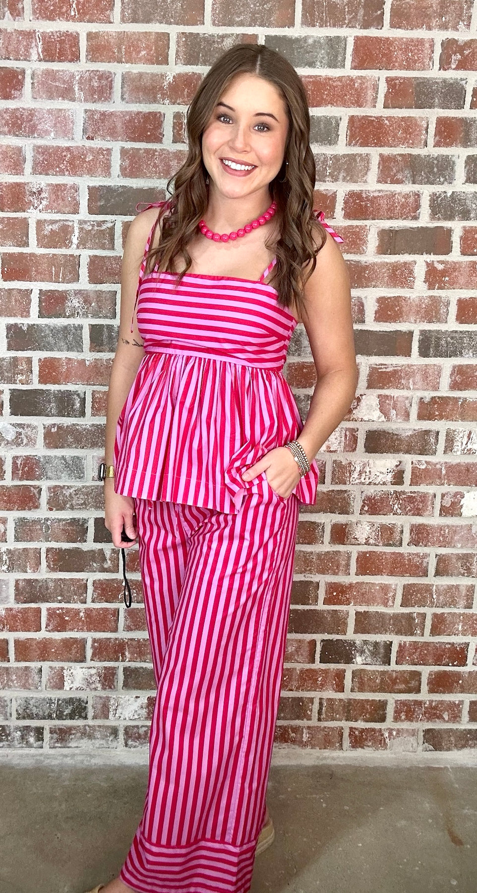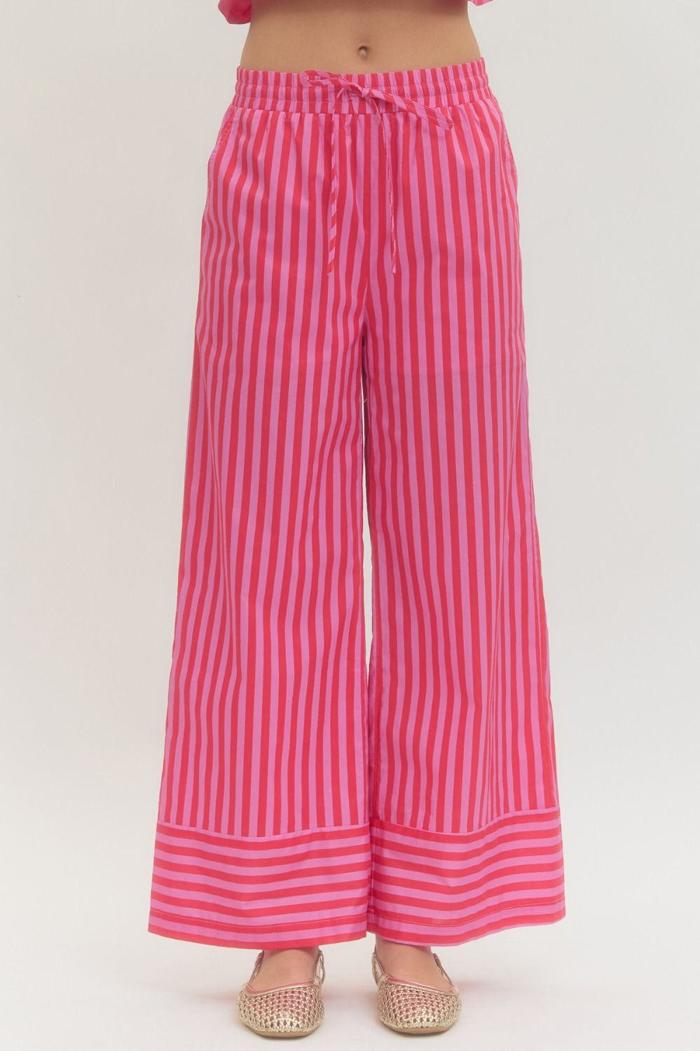 Striped wide-leg pants featuring elastic waistband with drawstring. Side pockets. Lined. Woven. Non-sheer. Lightweight.