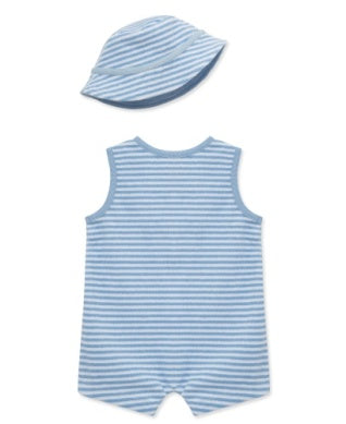 BLUE/WHITE STRIPED ROMPER AND HAT SET