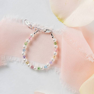 Children's precious sterling silver bracelet with soft white high-end Austrian pearls and beautiful pastel high-end crystals - Gorgeous pearls with a touch of color! This bracelet features adjustable sizing you will love, just move to the next ring as the child grows for a perfect fit. Bracelet is lead free, nickel free and is safe for your little one to enjoy and comes in a sweet gift box that kids love.