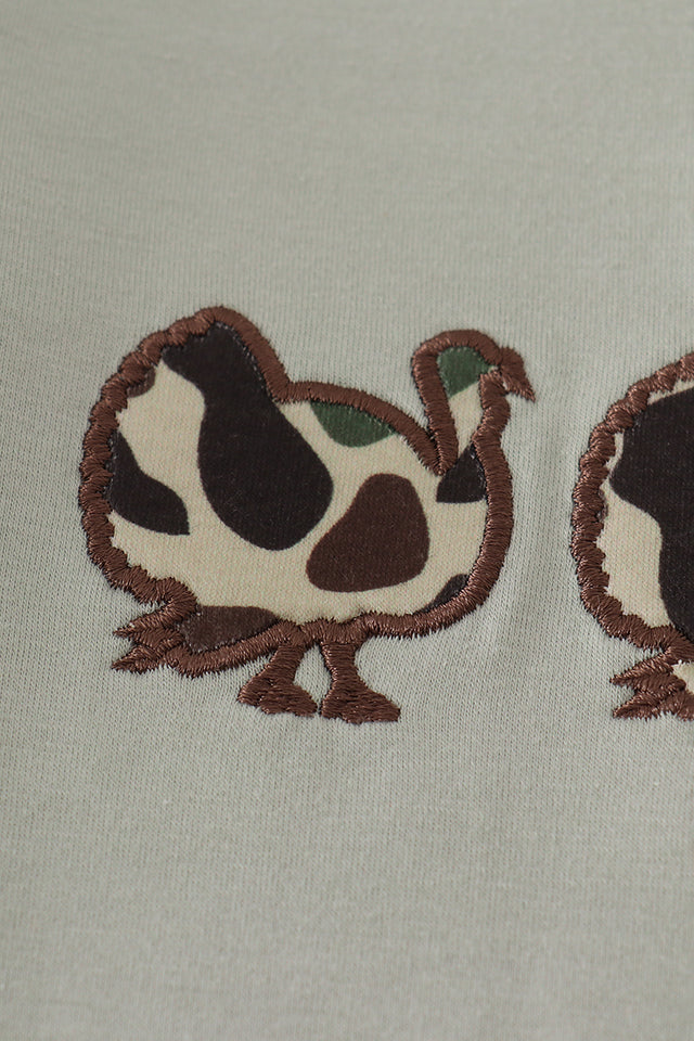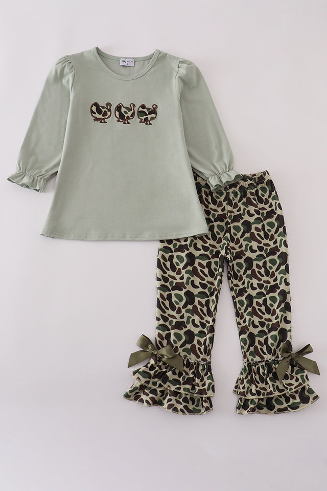 Get ready for fall fun with this Sage Camouflage Turkey Applique Ruffle Pants Set! Featuring playful turkey appliques and charming ruffles, this outfit blends cozy comfort with festive style. Perfect for little ones who love to move and play while celebrating the season in a unique, camo-inspired look.