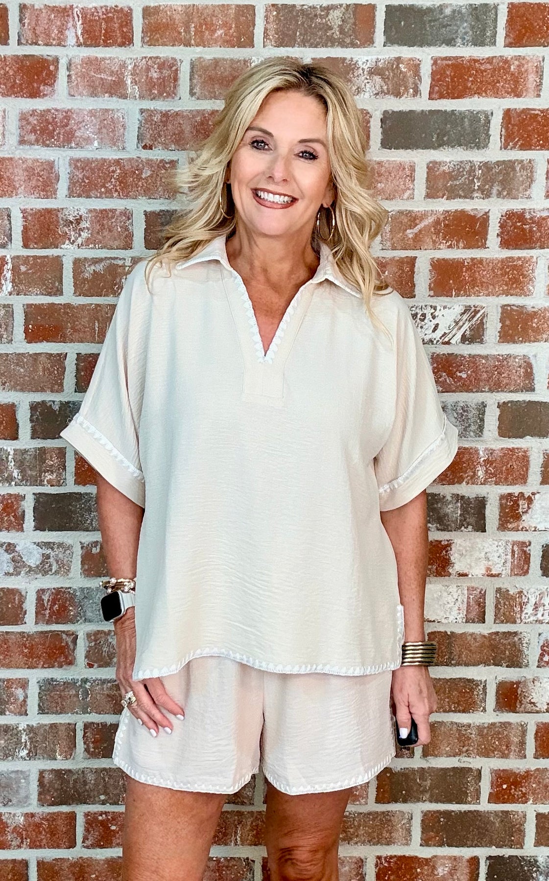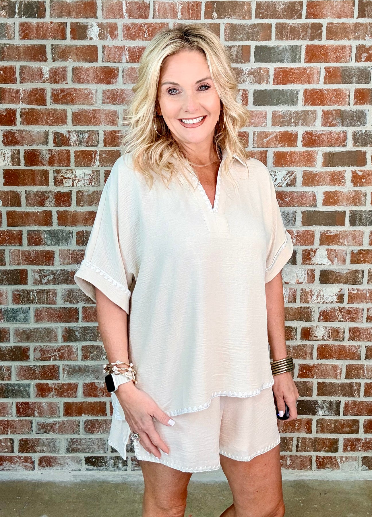 3/4 sleeves solid crinkle fabric loose fit top with scallop embroidery detail, side slit hem.- Styled with CARRIE SHORTS