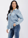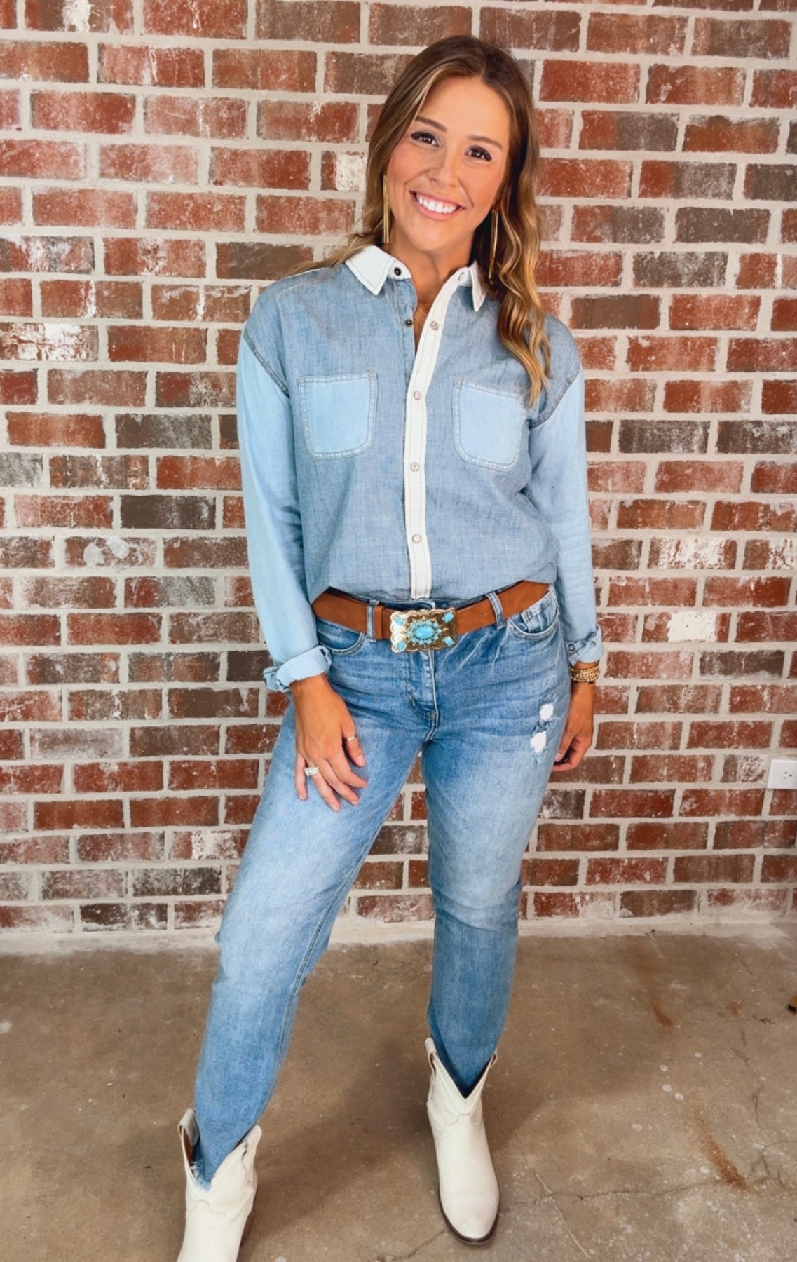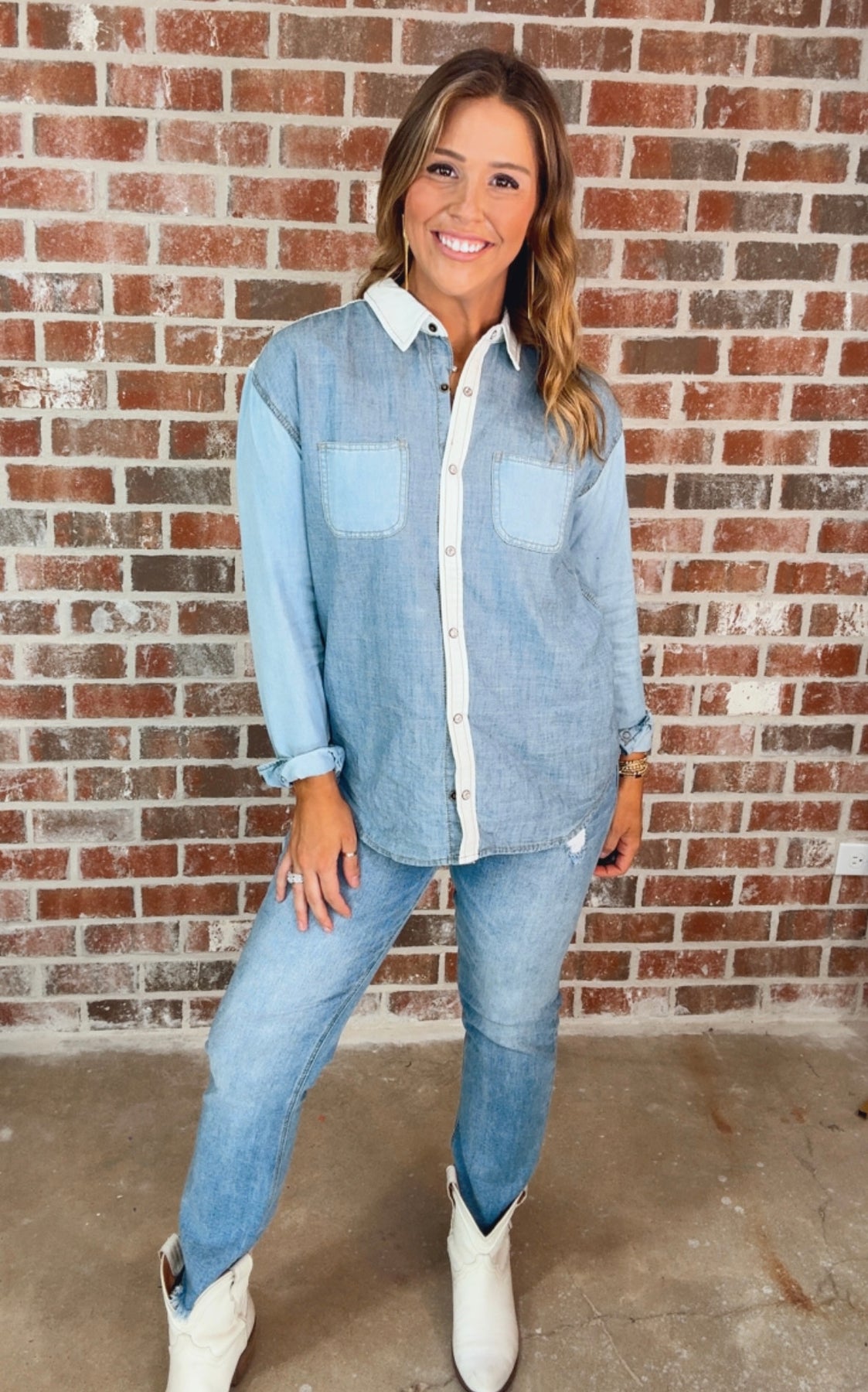 Soft chambray fabric, relaxed fit, trendy colorblock design, versatile styling options, perfect for layering