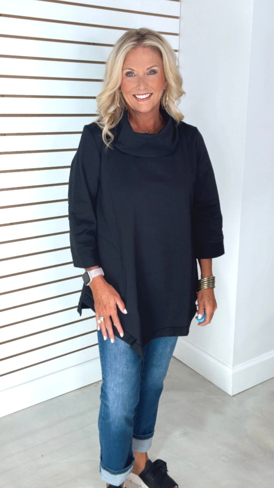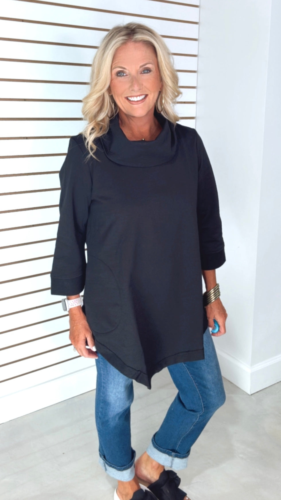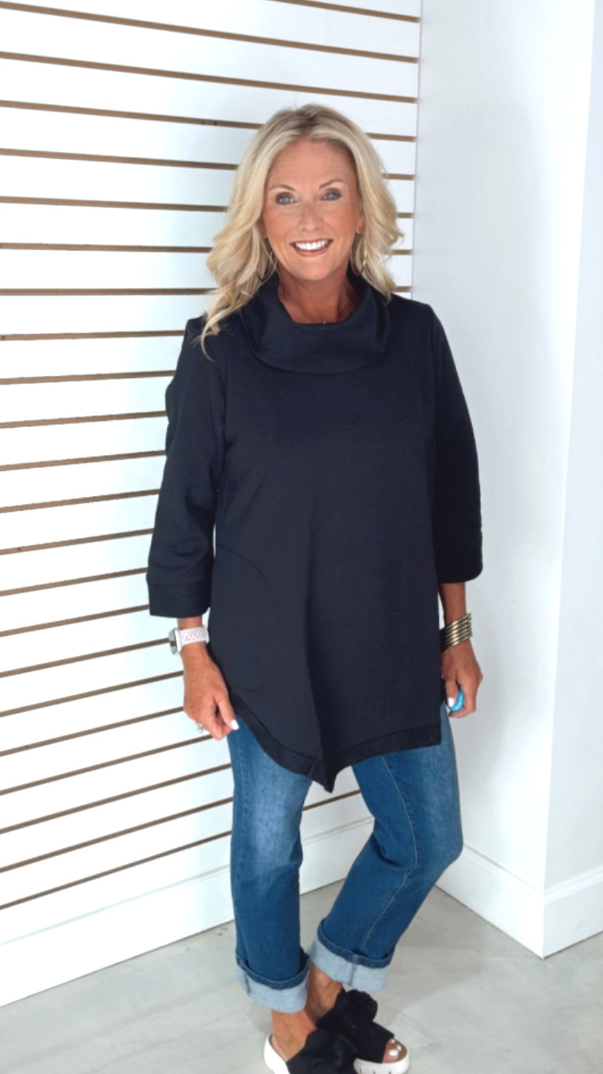 Cozy meets chic in the Ferrell Mock Neck Tunic. Crafted from brushed fleece French terry, it offers a soft touch that feels like a gentle hug. The playful asymmetrical front with a baby cover finish adds a unique twist, while the mock neck keeps things stylishly snug. Plus, dual inside side pockets give you a secret spot for your essentials. Perfect for lounging or stepping out with flair!