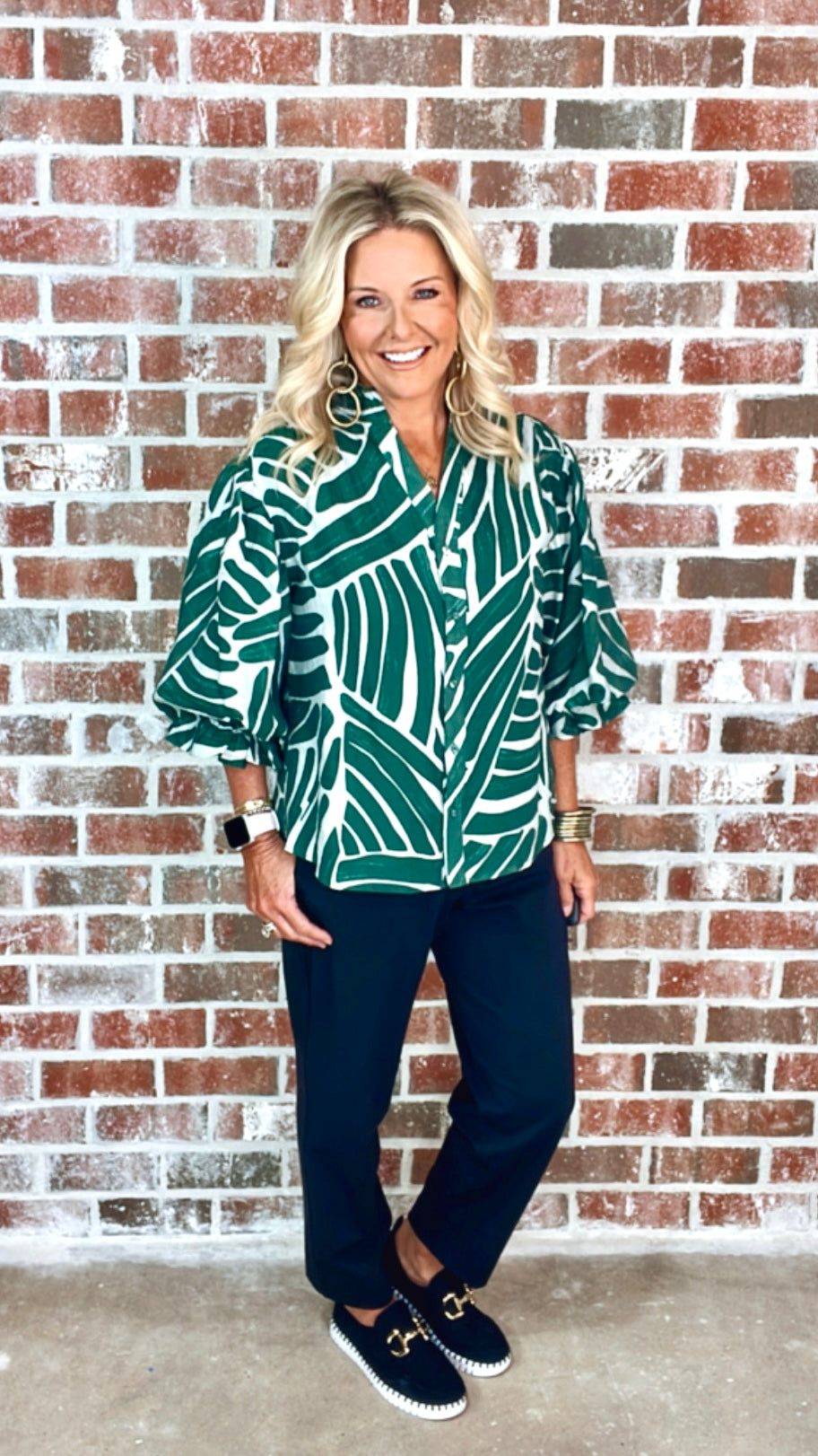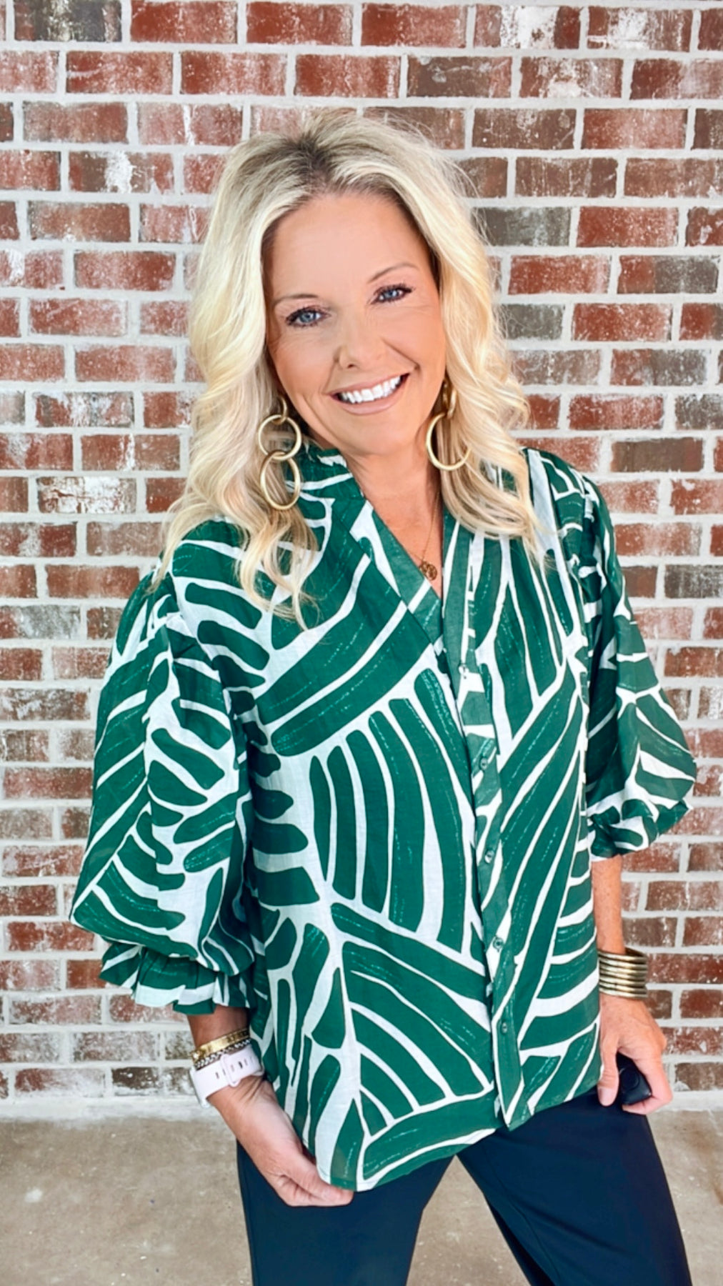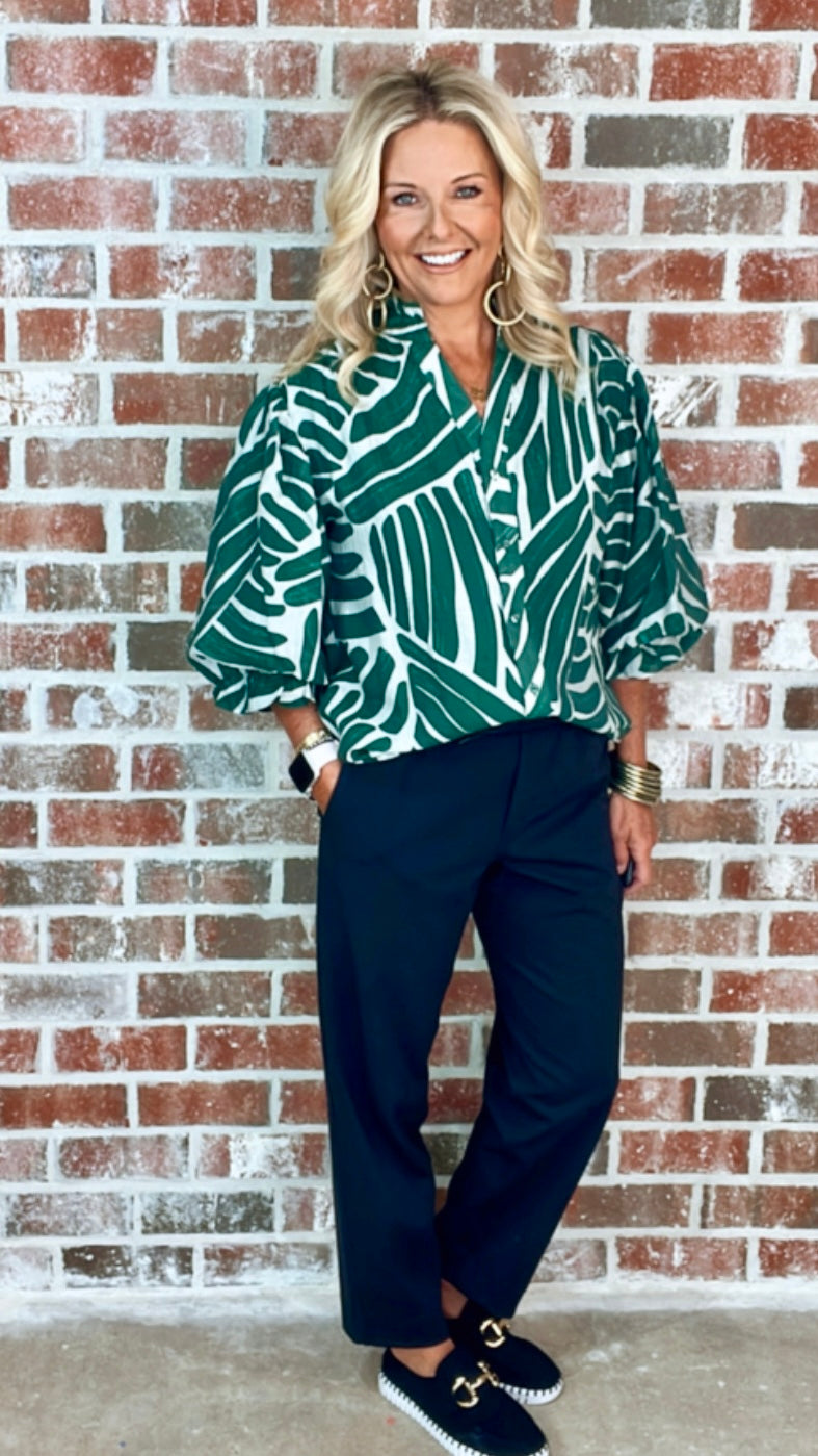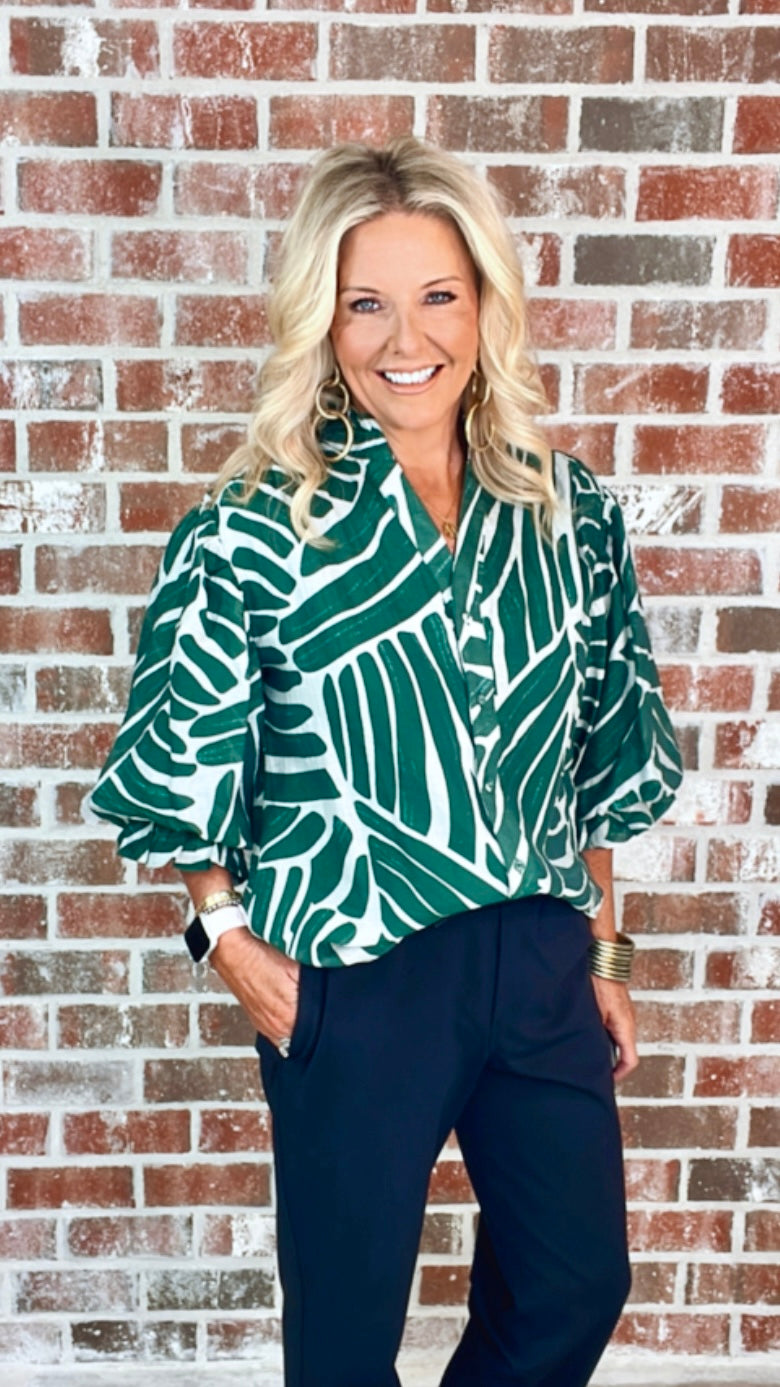 Abstract Print Button Down Top with 3/4 Length Gathered Balloon Sleeves. The Top is Lined