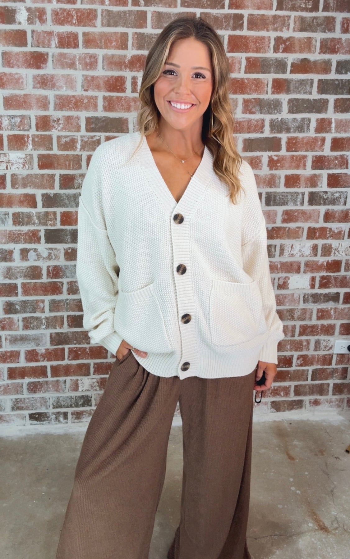 Charm Them All In This Versatile And Chic Cardigan That Is Designed Into A Relaxed Silhouette With A V-Neck, Drop Shoulders And Long Sleeves. It Is Fastened By A Button Closure Down The Center And Accented With Front Patch Pockets.100% Acrylic