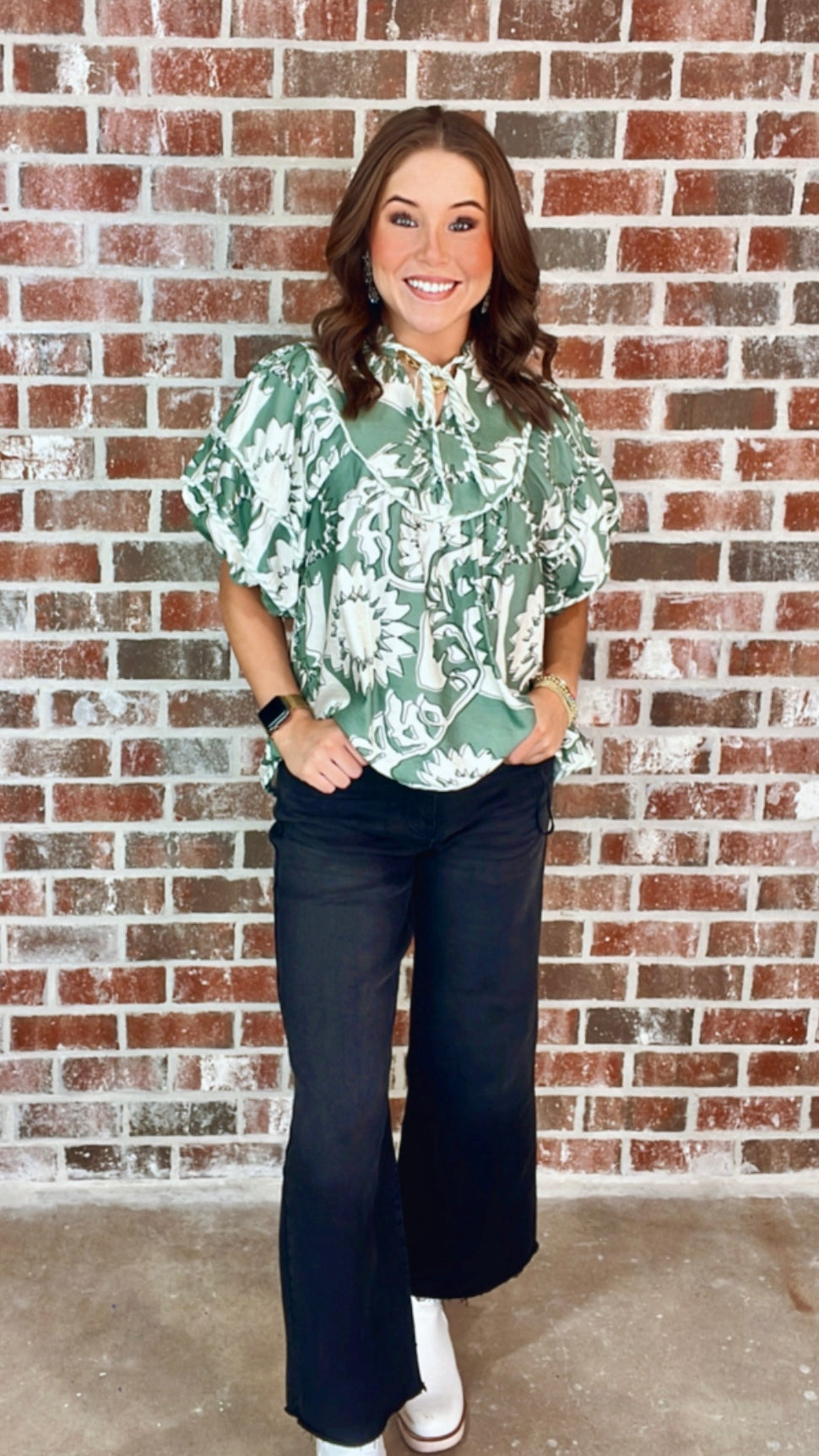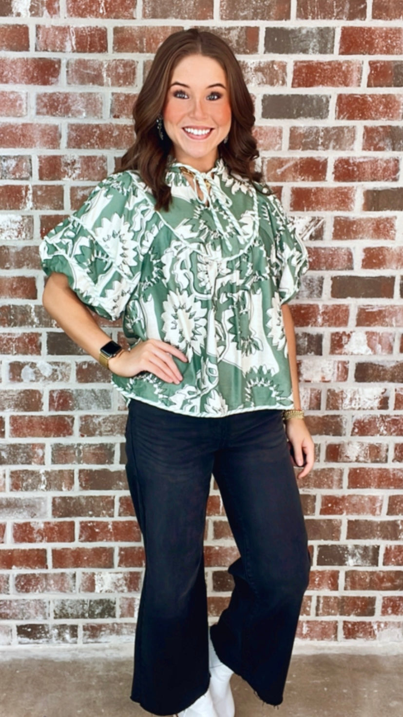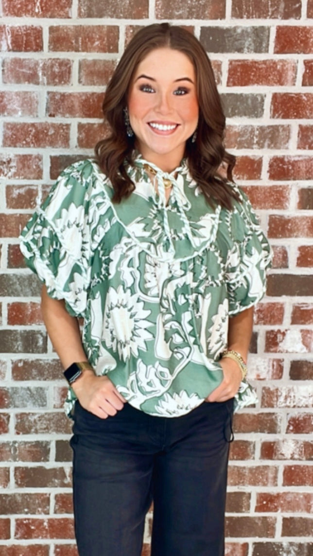 Printed Short Puff Sleeve Top with Striped Binding Details and a Tie Neck String