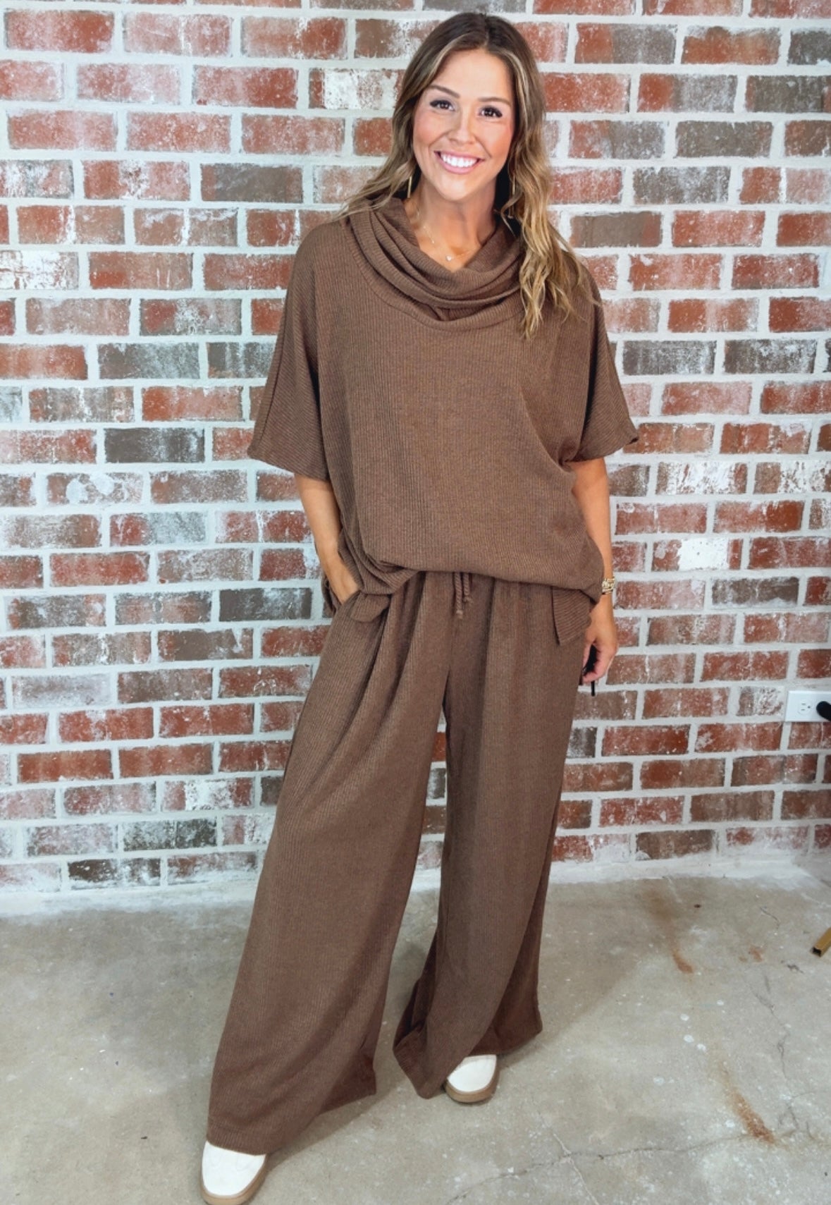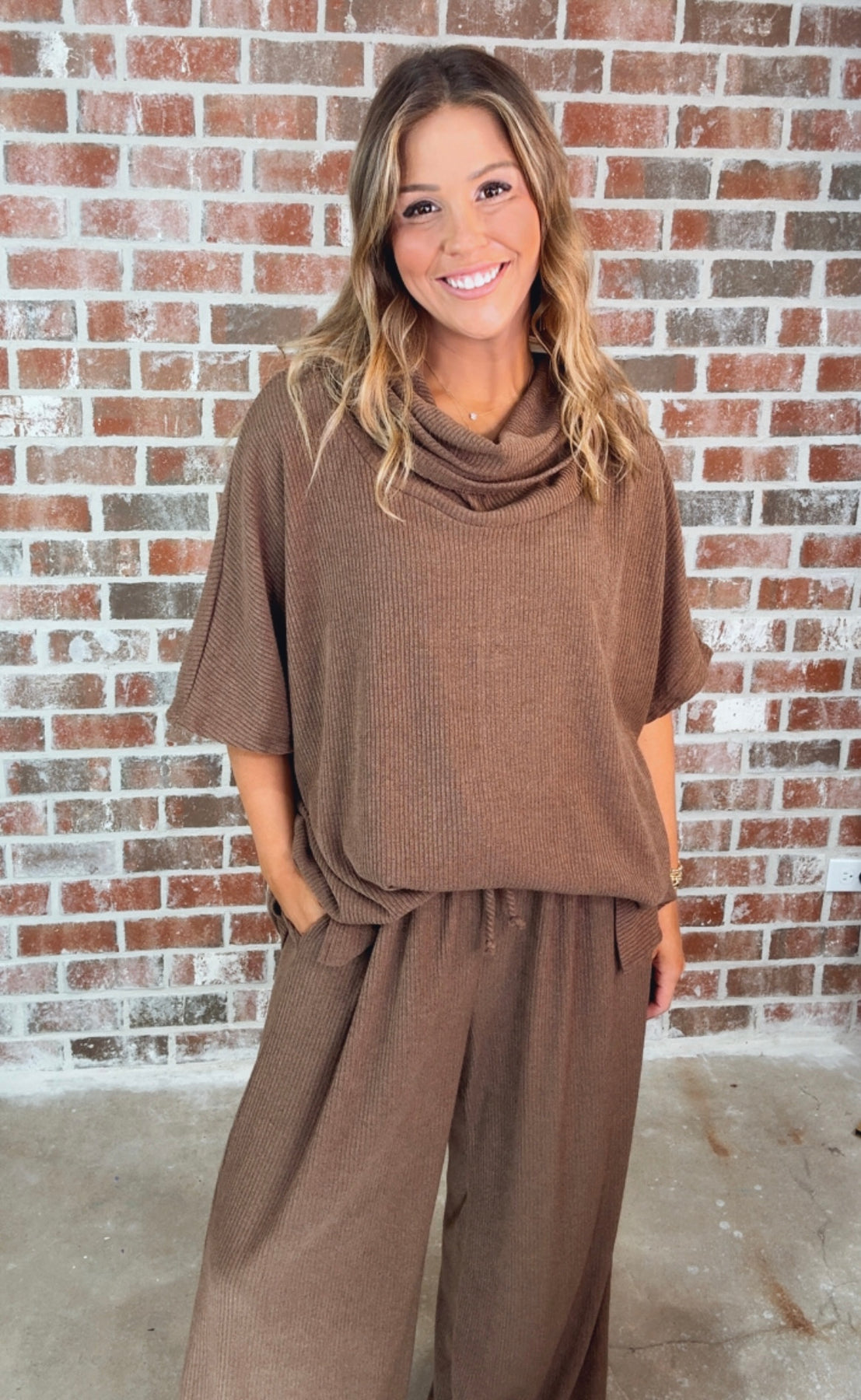 Indulge in effortless comfort with this 2 piece set, featuring a soft cowl neck poncho top and relaxed pants for an elevated loungewear/travel look.