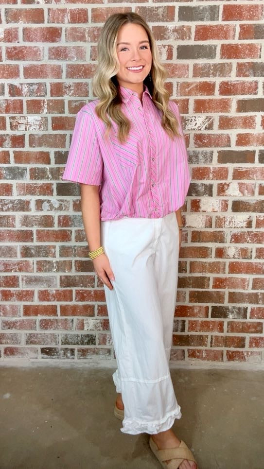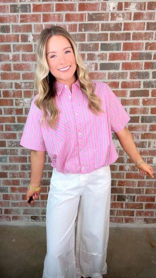 Striped short sleeve button-down blouse featuring elasticated bubble hem. Button closure at front. Front patch pocket. Unlined. Woven. Non-sheer. Lightweight.