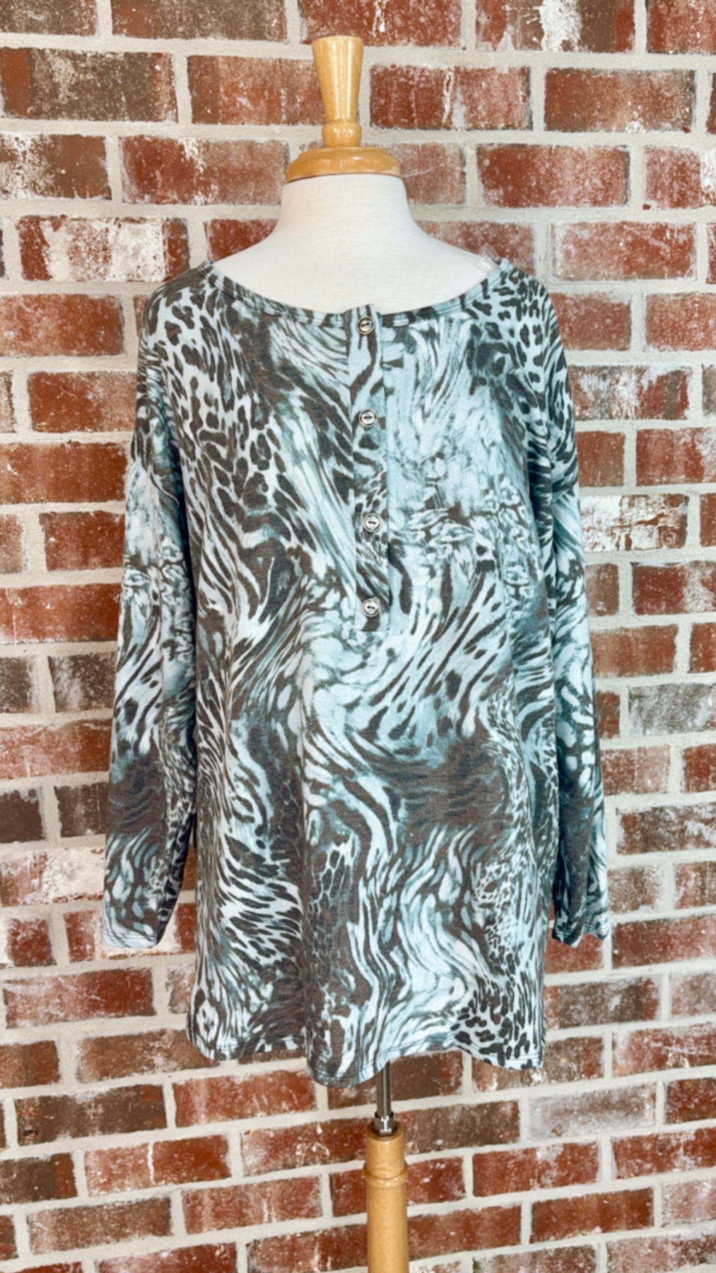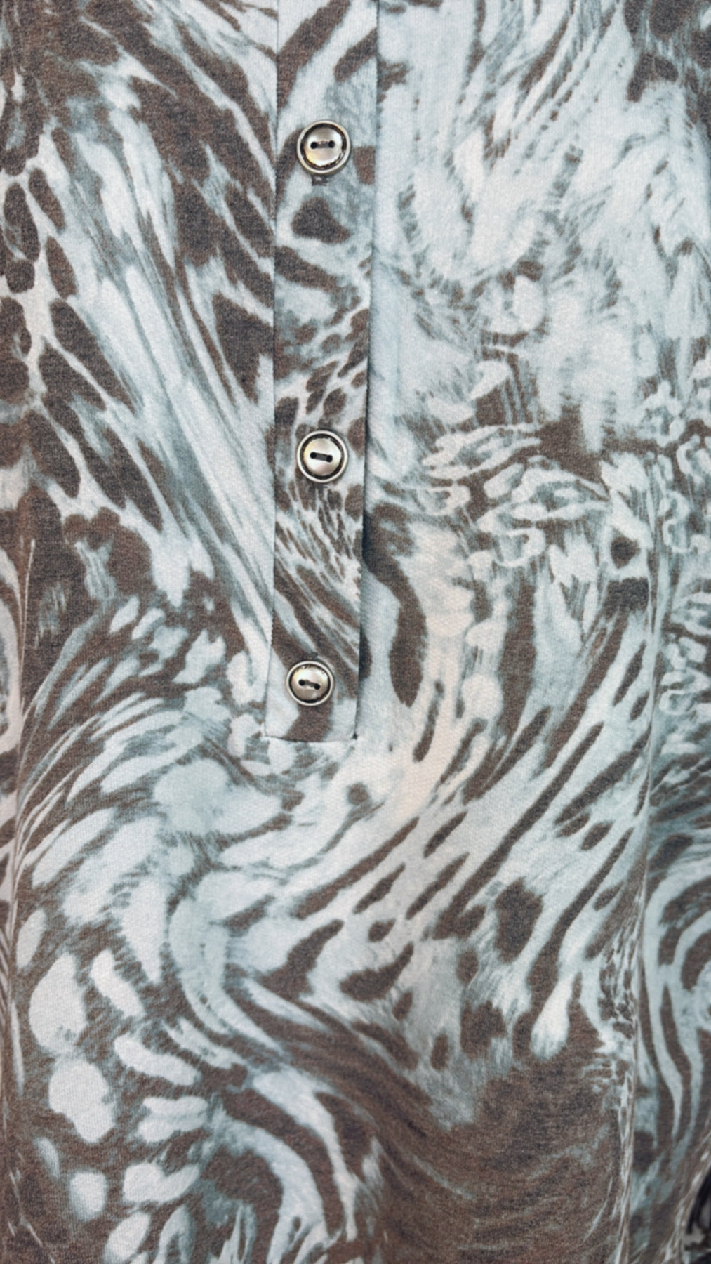 Fun printed pull over with long sleeves and button down detail. Round neckline, flowy fit, knit. Non sheer.