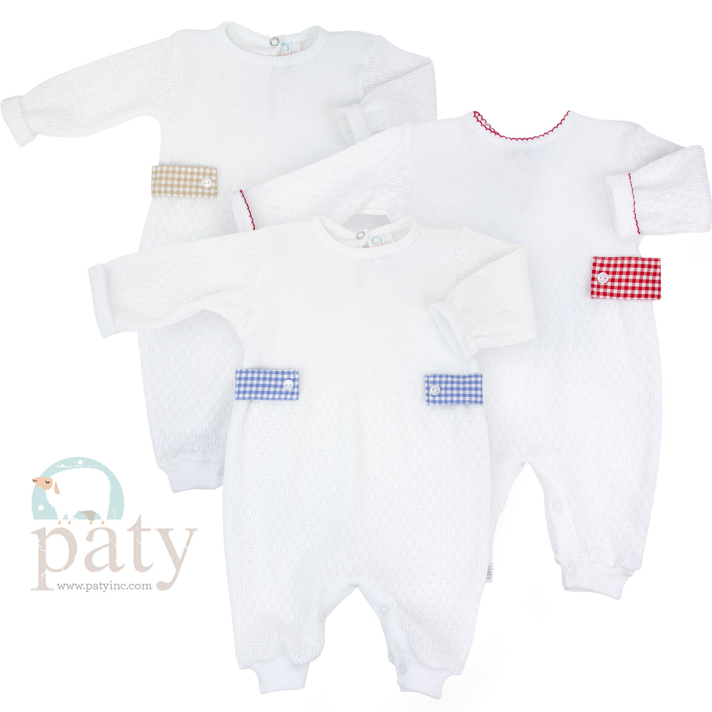 PATY, INC. LONG SLEEVE ROMPER WITH GINGHAM SIDE TABS
